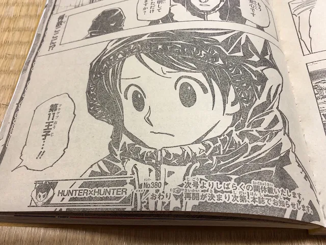 La más reciente edición de la JUMP anuncia que Hunter x Hunter estará de nuevo en hiatus a partir del capítulo 380 que saldrá esta semana, la info no menciona una fecha tentativa de regreso.
